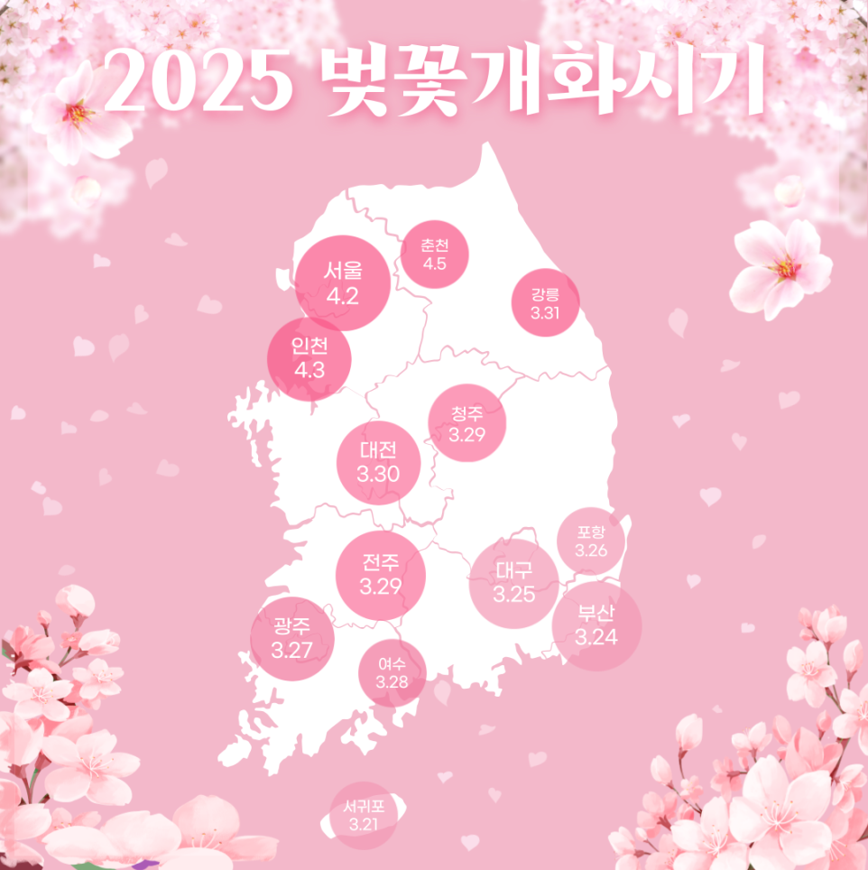 - 2025년 벚꽃은 평년보다 3~8일 일찍 피어날 예정이에요.