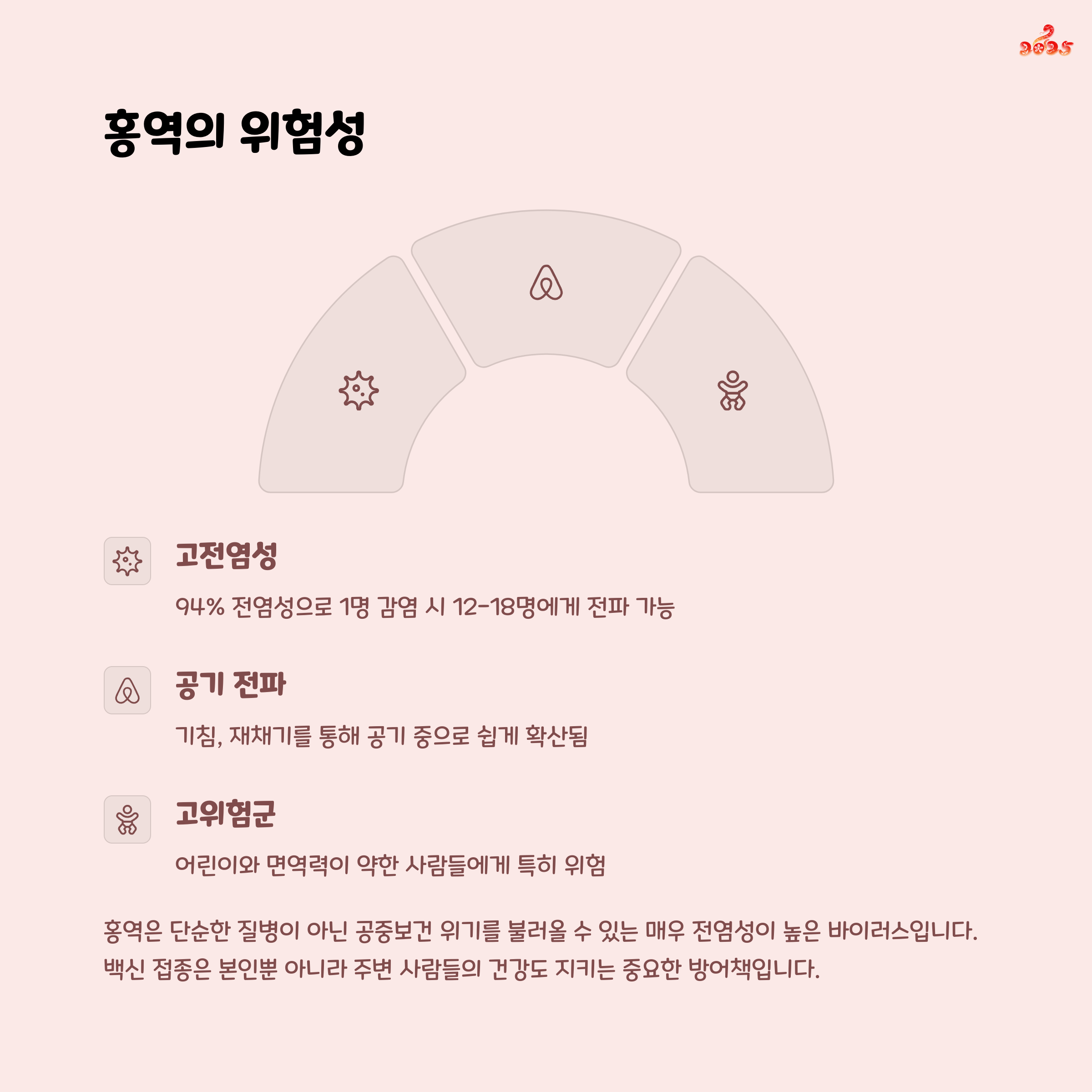 홍역은 공기 전염으로 매우 빠르게 퍼지는 감염병입니다.