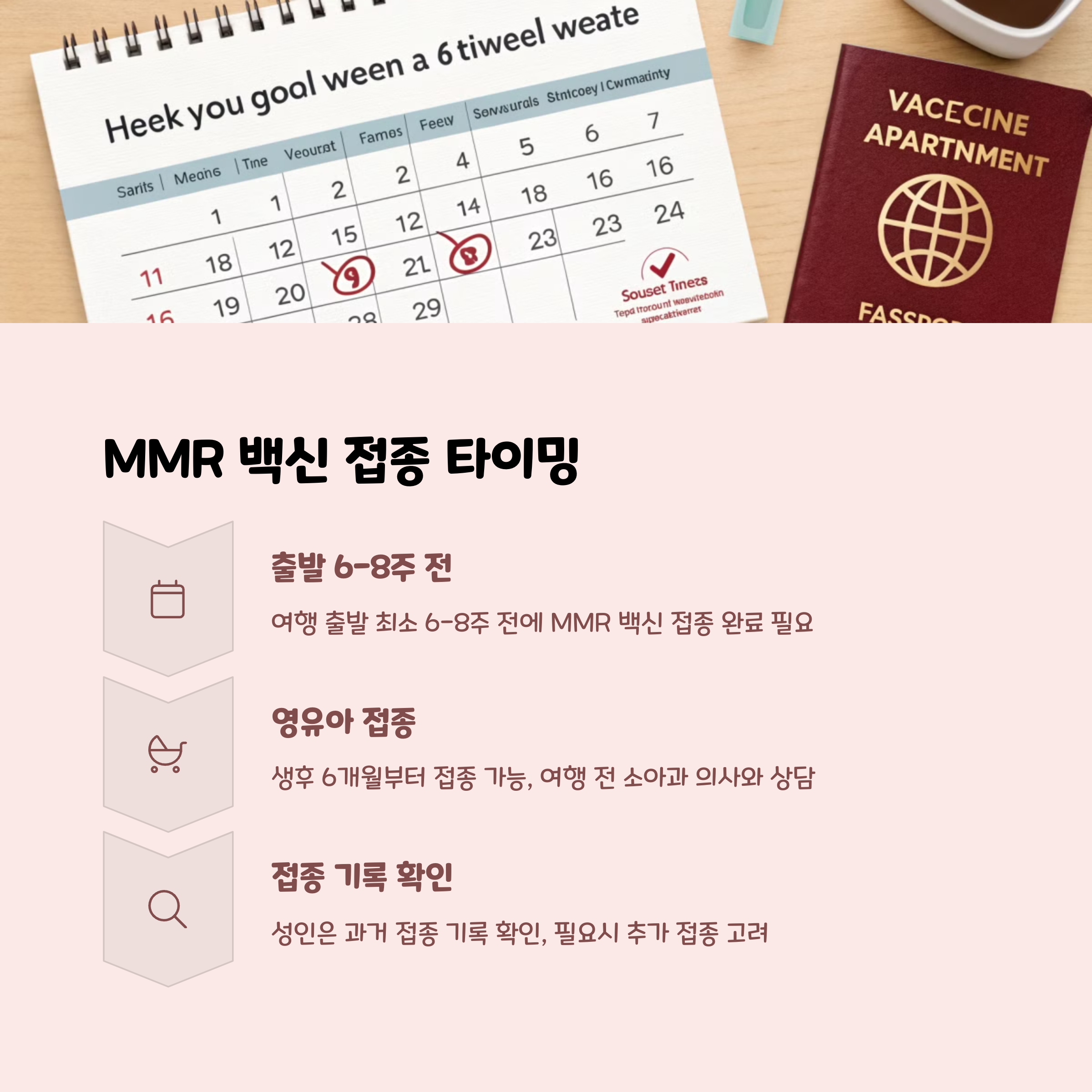 MMR 백신은 2회 접종이 필요하며, 최소 출국 6주 전에 맞아야 합니다. | 손 위생, 마스크 착용, 병원 위치 사전 확인이 필수입니다. |