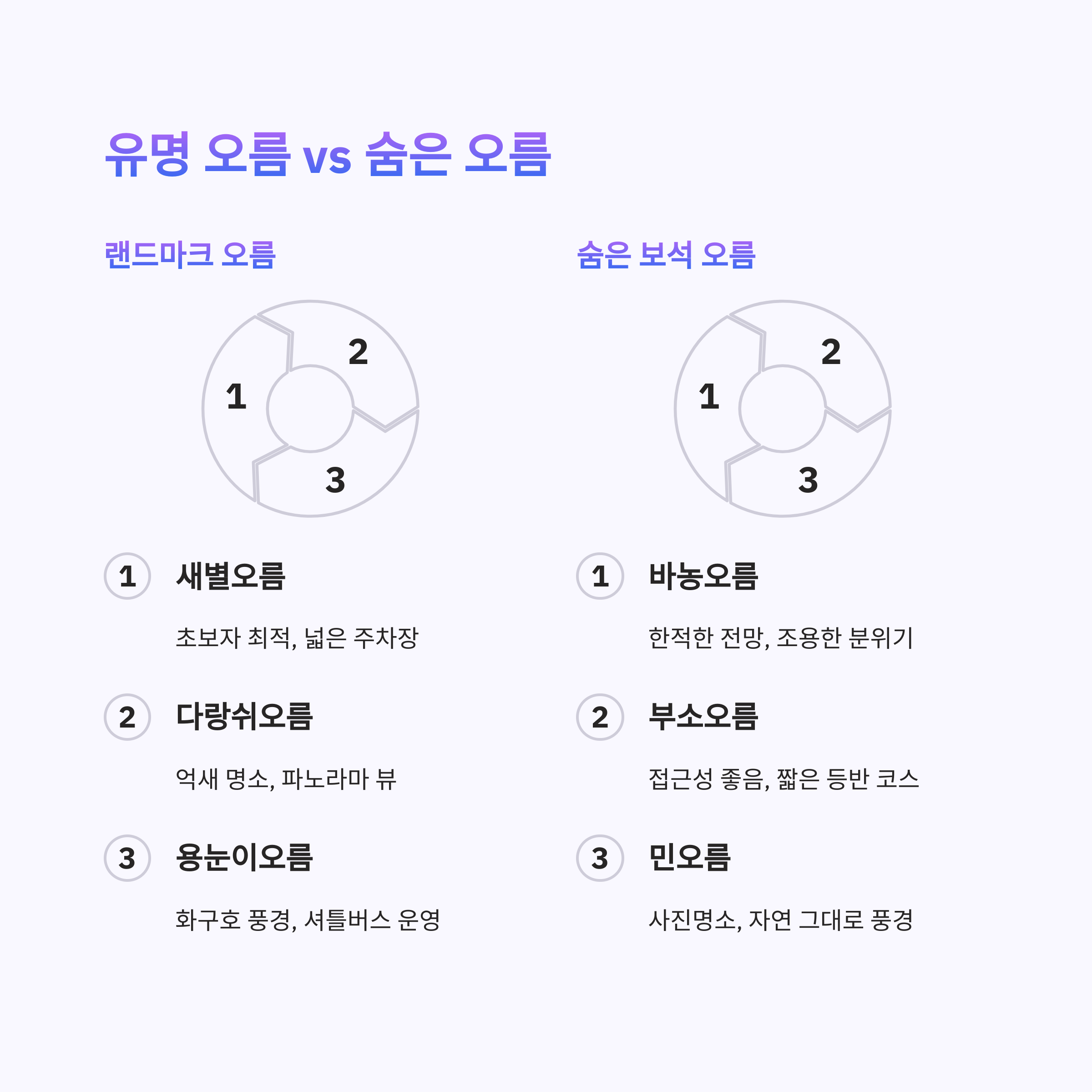 오름별 난이도와 교통, 계절별 풍경까지 한눈에 비교!