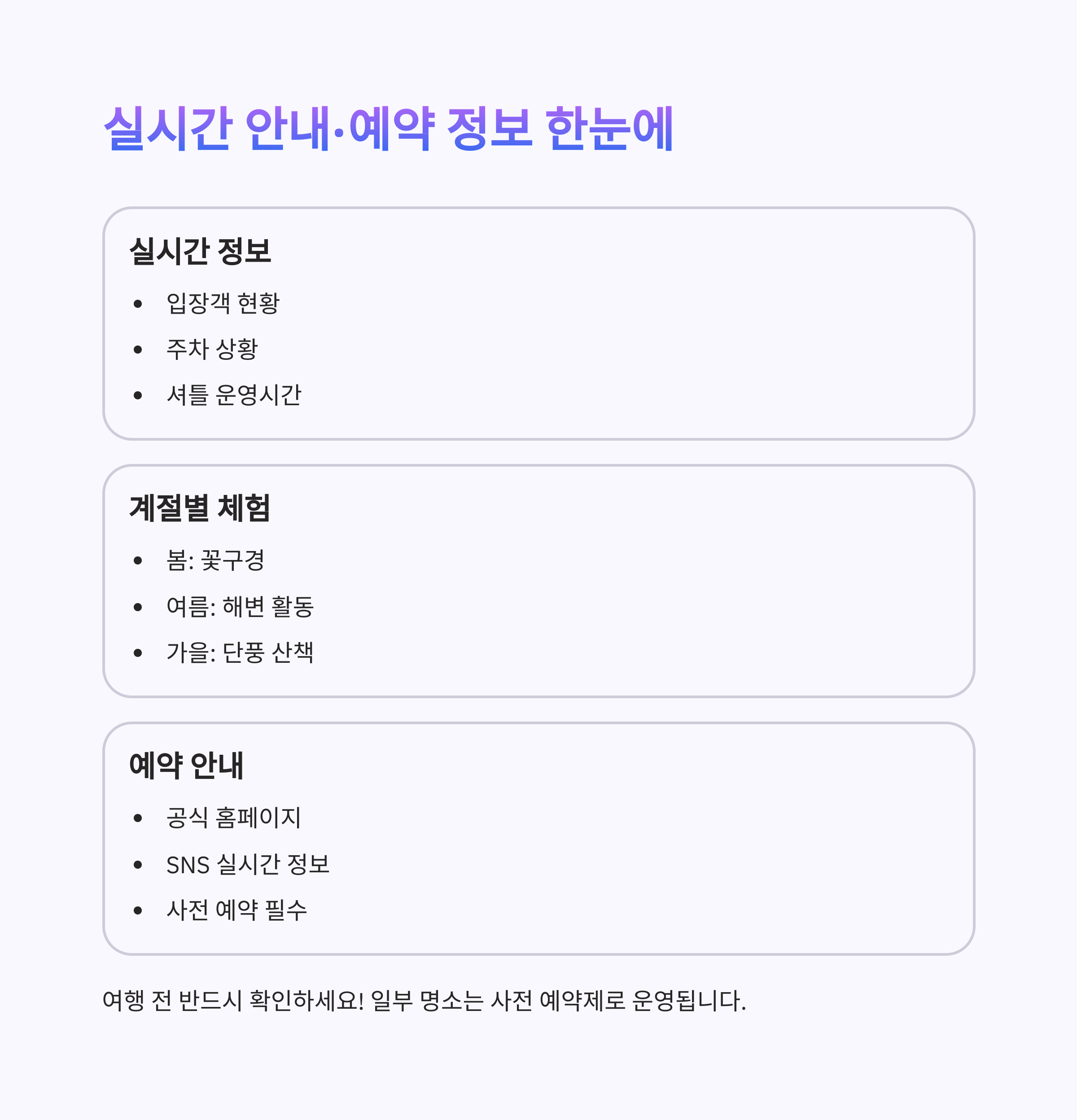실시간 안내와 예약, 혼잡도 체크, 운영시간 확인만 잘하면 누구나 만족스러운 힐링 여행이 가능합니다.