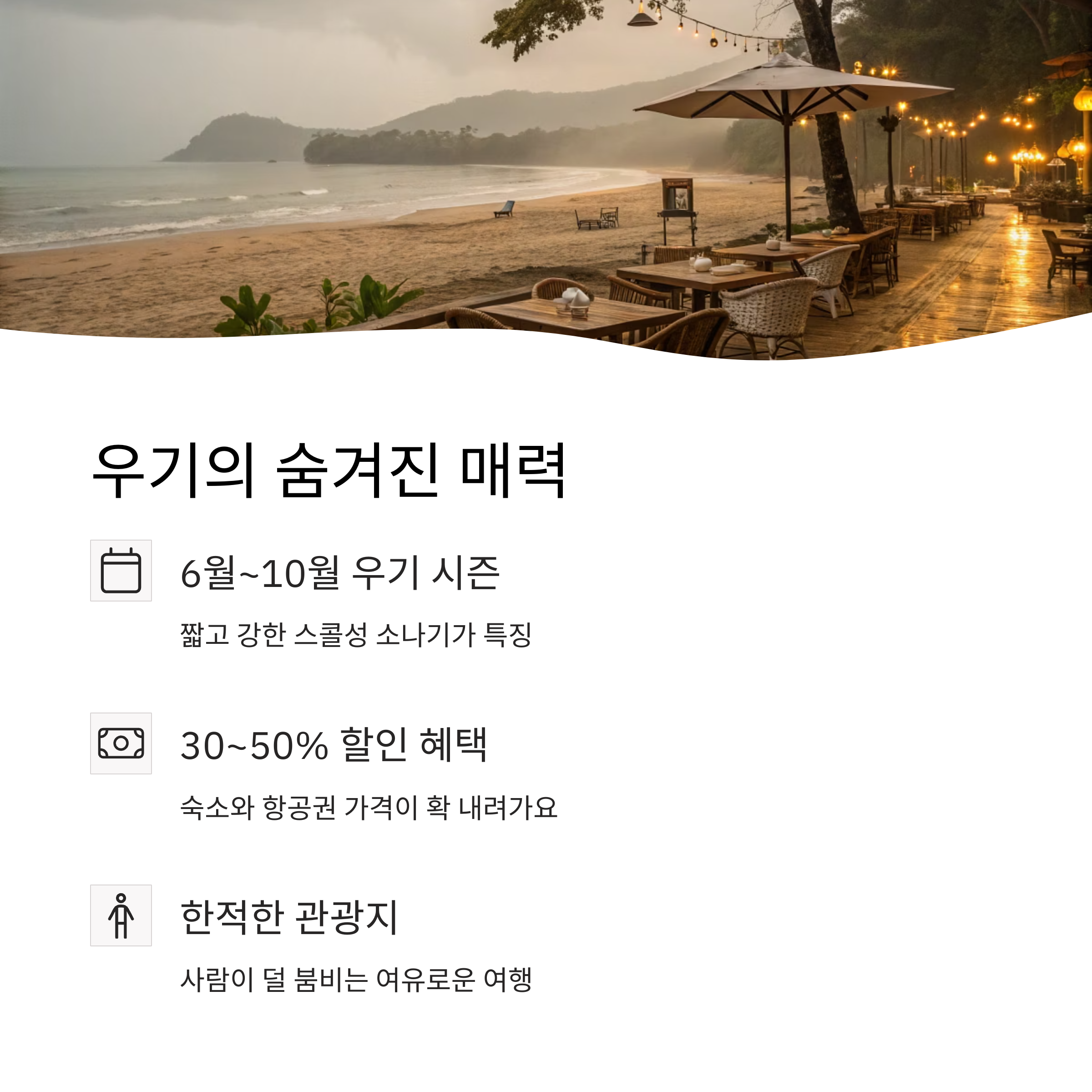 반면 우기는 할인된 가격, 여유로운 거리, 여운이 있는 풍경이 있어요.