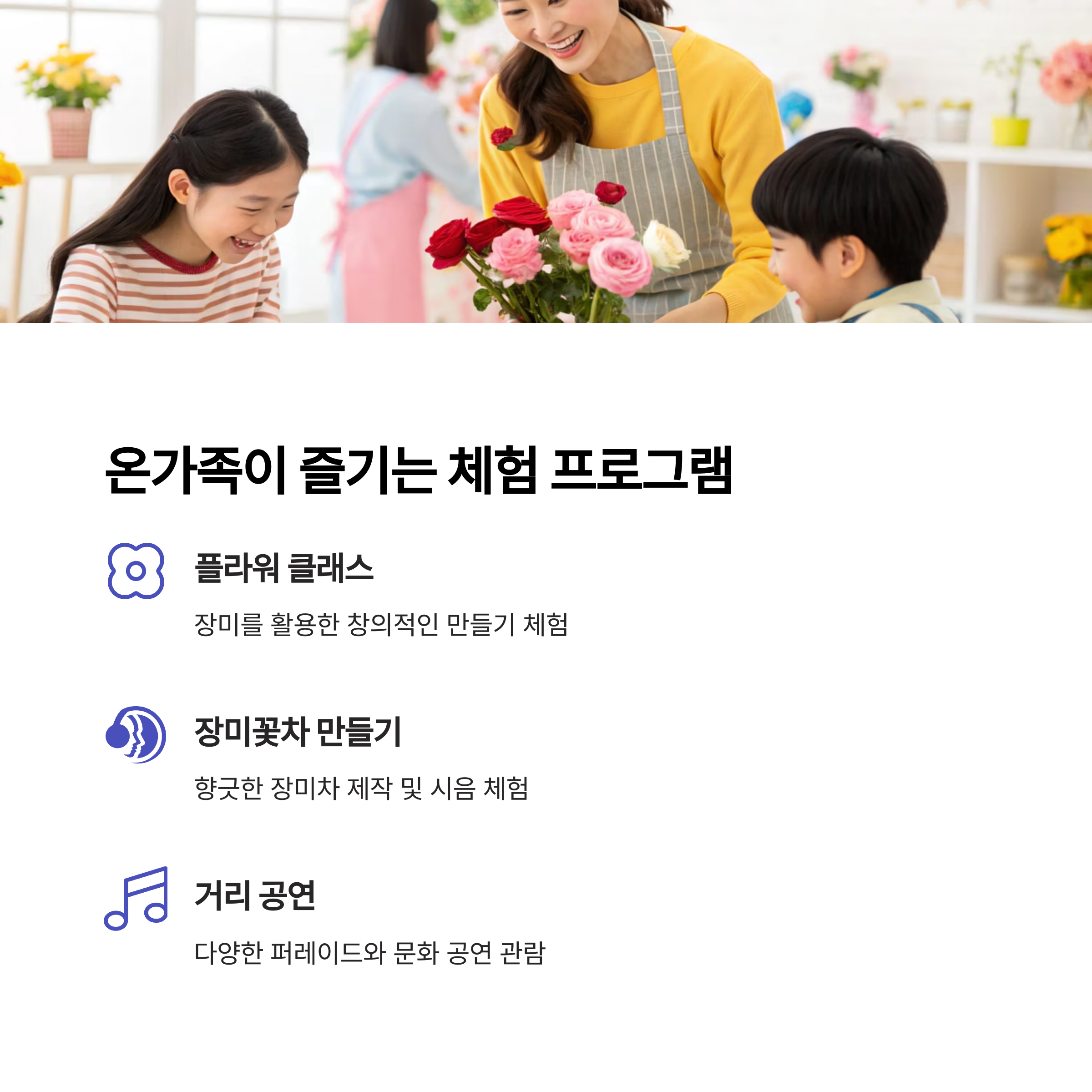 아이들과 함께 즐길 수 있는 플라워 클래스, 장미꽃차 만들기 체험, 거리 공연과 퍼레이드 등은