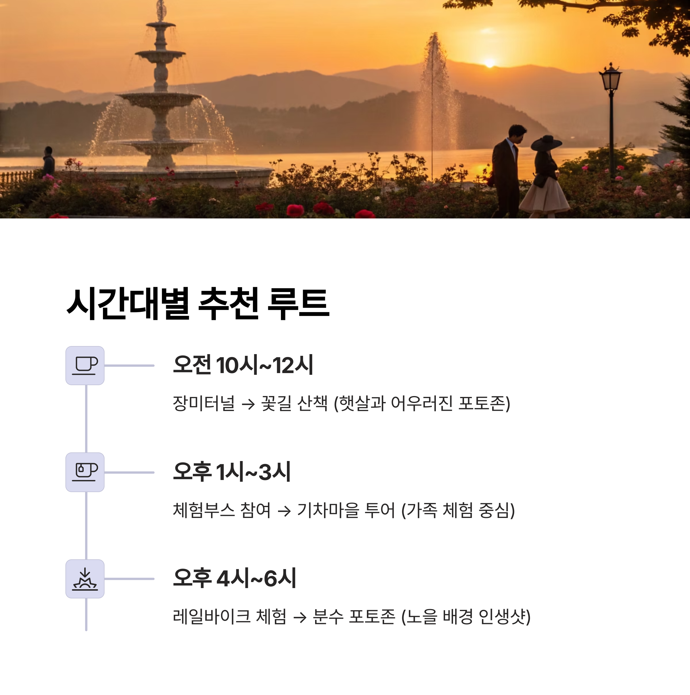 | 오후 4시~6시 | 레일바이크 체험 → 분수 포토존 | 노을 배경 인생샷 |