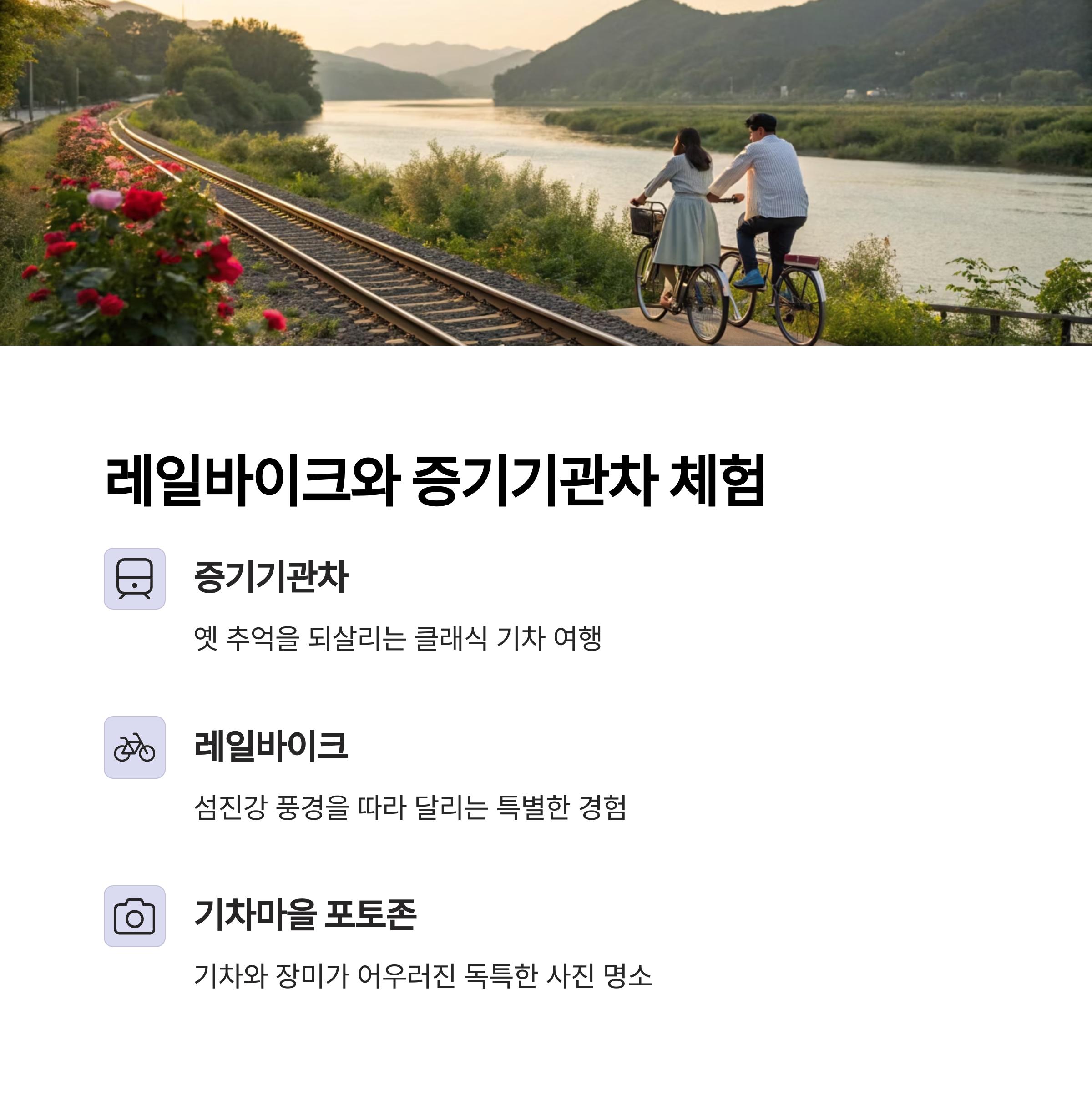 기차마을 근처에는 섬진강, 압록 유원지 등 자연과 연계된 관광지가 많아